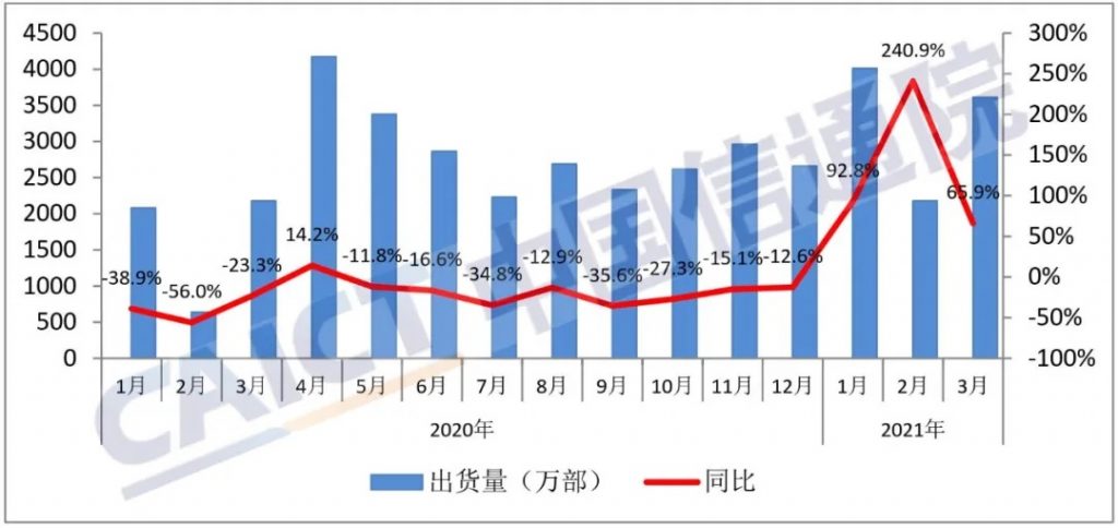 2021年3月,国内手机商场整体出货量3609.4万部,同比增加65.9%;1-3月,国内手机商场整体出货量累计9797.3万部,同比增加100.1%。