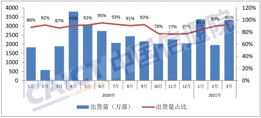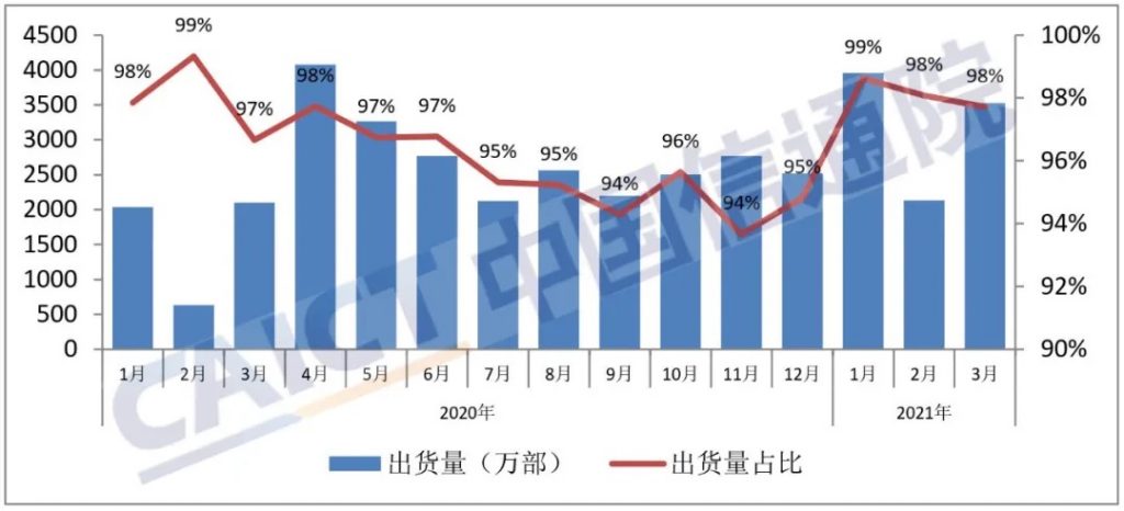 2021年3月,智能手机出货量3526.8万部,同比增加67.7%,占同期手机出货量的97.7%。1-3月,智能手机出货量9618.2万部,同比增加101.5%,占同期手机出货量的98.2%。
