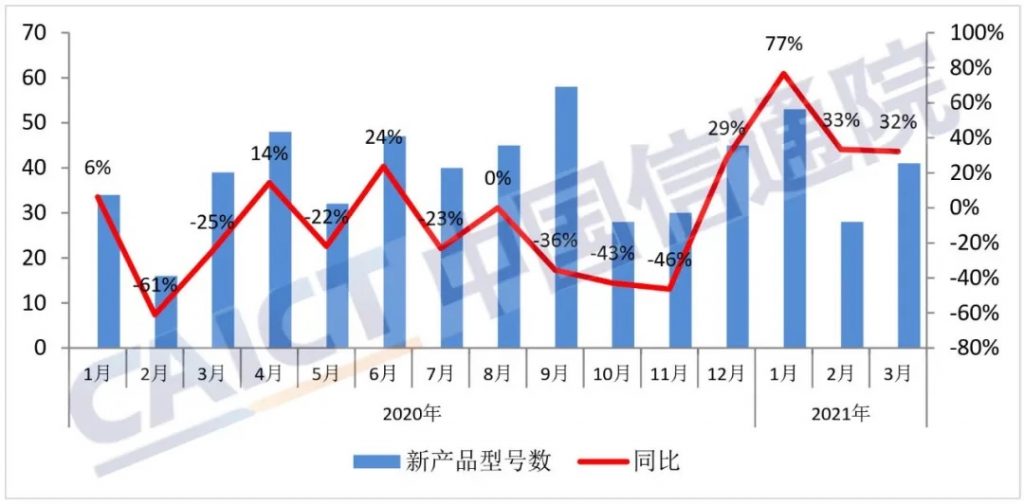 2021年3月,国内手机上市新机型41款,同比增加32.3%。1-3月,上市新机型累计122款,同比增加48.8%。