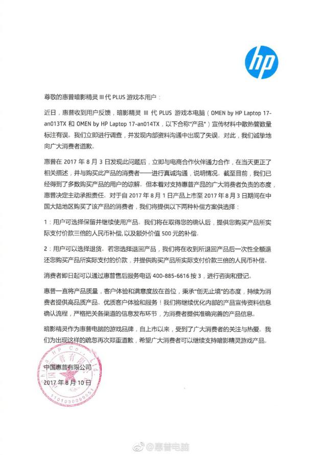 惠普曾在 ChinaJoy 上发布了阴影精灵III代Plus游戏本后遭受了一次“散抢手”事情——官方宣扬中强调了其散热作用:选用双电扇5根热管的散热规划,以及两个超大进风口和四周突起的脚垫,可确保进风足够。但是,当抢购的顾客拿到机器后却发现,此前被要点宣扬的5根散热管,竟变成了3根。真实状况是,价格8999元的“GTX1060”类型只要3根热管,价格10999元的“GTX1070”类型则只要4根热管。尽管过后官方拿出了三倍的真金白银赔付,但仍然在互联网产品的虚伪营销史上留下了一个污点,特别是这样的五百强科技企业。