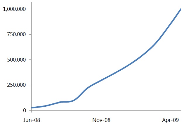 大会上宣告说话。TechCrunch 50 是 TechCrunch Disrupt 的前身。2009:百万用户到达