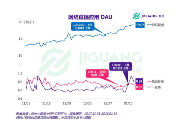 的工作人员告知动点科技,尽管没有详细数据,但上线答题玩法后对App的下载量和活泼度都有不小的影响。极光大数据最近一份数据陈述也闪现,从西瓜视频、花椒直播和一直播的日活数体现看来,这三个直播途径相同从直播问答节目中获益匪浅。以今日头条旗下的西瓜视频为例,在上一年12月25日《百万英豪》栏目上线以来,这款使用的日活泼用户数便开端攀升。在本年1月14日当天,西瓜视频的日活泼用户数到达1907万。