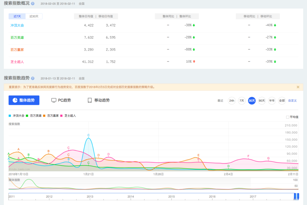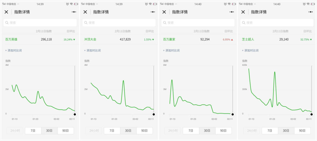 从微信大数据的指数(微信大数据是2017年3月腾讯根据微信推出的移动端数据途径,用以了解某一关键词或刷屏工作在一段时刻内微信评论热度的改变。)来看,百万英豪、冲顶大会、百万赢家和芝士超人四个头部玩家,其查找指数自一月下旬后就开端下滑。