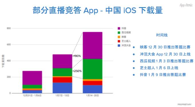 而包含《冲顶大会》、西瓜视频旗下《百万英豪》、映客旗下《芝士超人》看起来也在为新年静静憋大招,“撒币”手笔也不容小觑。总归,新年将会是一场新的狂欢的开端。