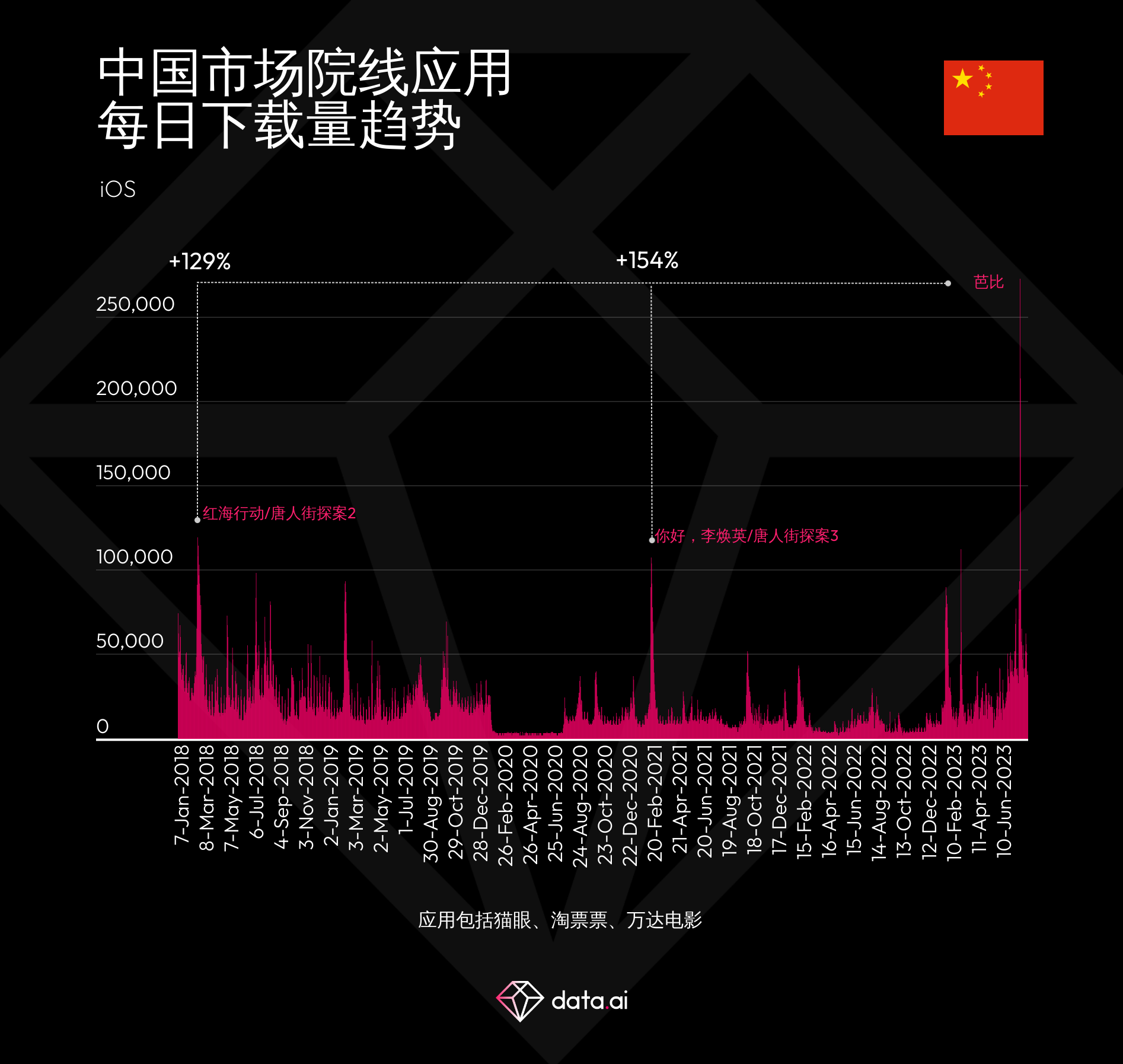 在我国,仅《芭比》上映期间经过使用购票需求达到了现象级增加(仅 iOS 数据)。其间,最大电影票务使用的算计下载量比从前最高记载高出 129% 。此前的记载是在《唐人街探案 2》和《红海举动》上映期间创下的。
