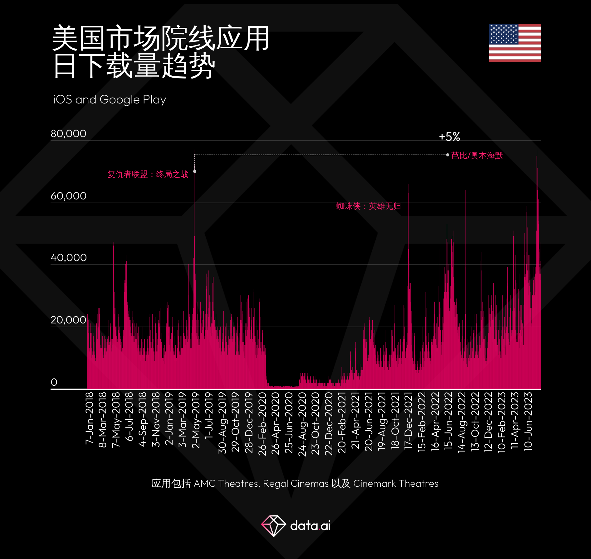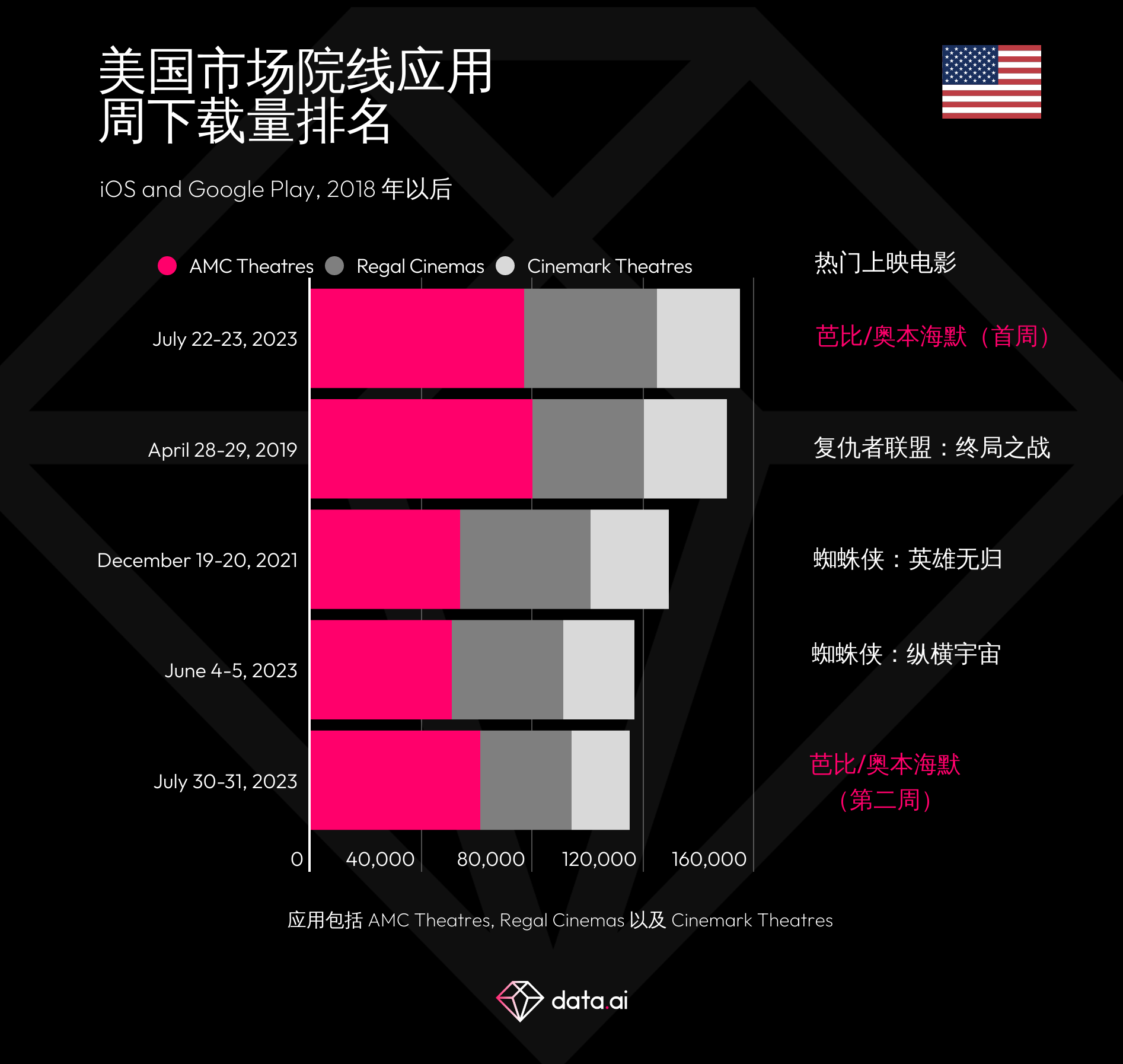 从数据能够看出,在“芭本海默”热潮的带动下,美国头部影院使用下载量记载是 2020 年春夏日最低记载的近 203 倍,显现出自疫情时期以来影院业的微弱复苏程度。